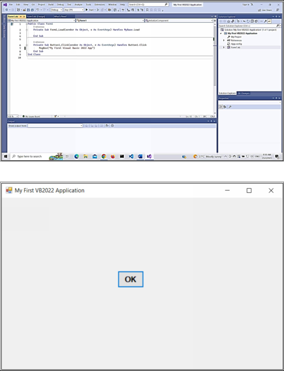 Clicking the Start button on the toolbar or press F5 to run the application will launch the runtime interface, as shown in Figure 1.12. Executing the application by clicking the OK button will bring up a dialog box that displays the “My First Visual Basic 2022 App" message, as shown in Figure 1.13. The function MsgBox is a built-in function of Visual Basic 2022 which can display the text enclosed within the brackets.
